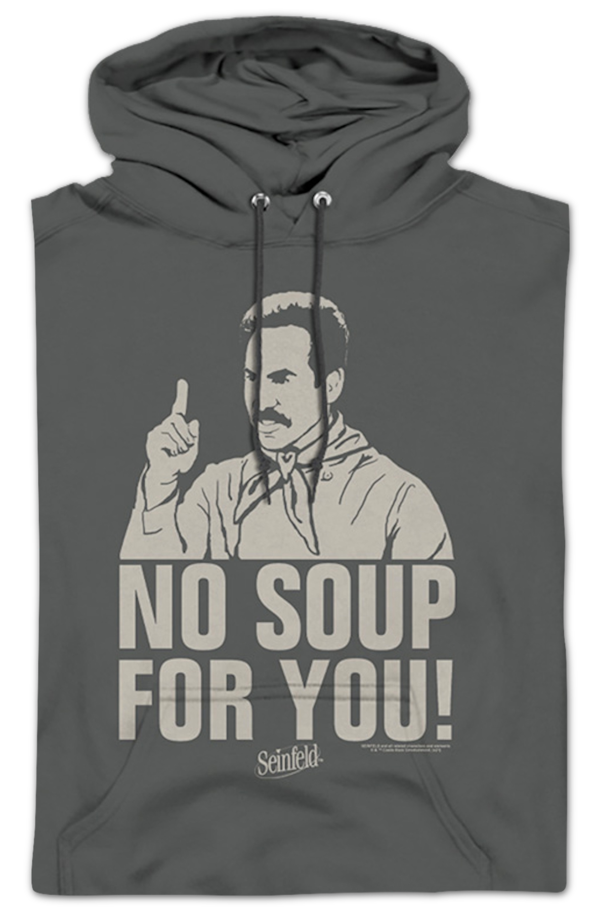 This Seinfeld hoodie features an image of the Soup Nazi yelling "No Soup For You!"