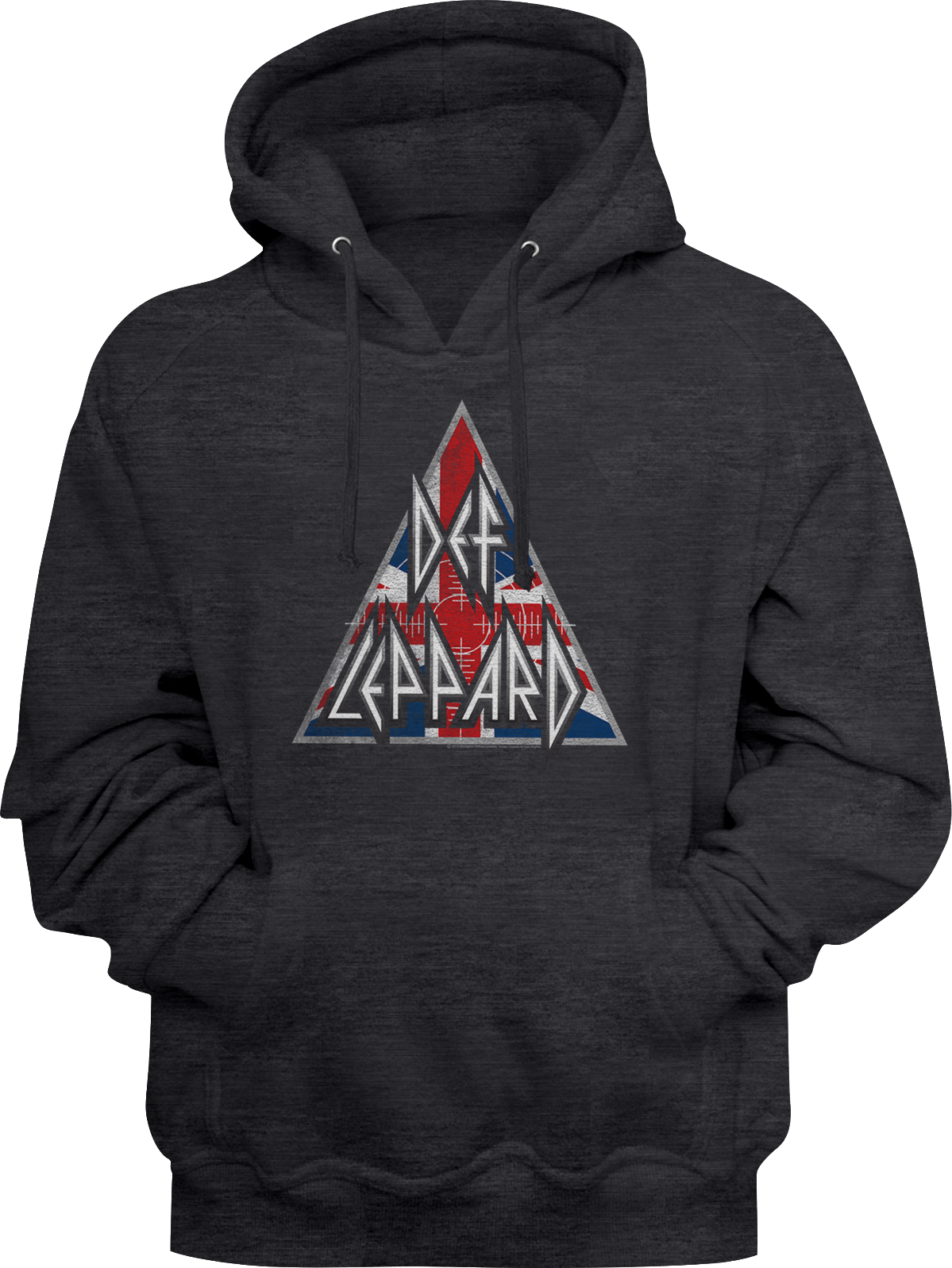 This Def Leppard hoodie shows the band's logo set against a triangular shaped Union Jack with a marksman's site.