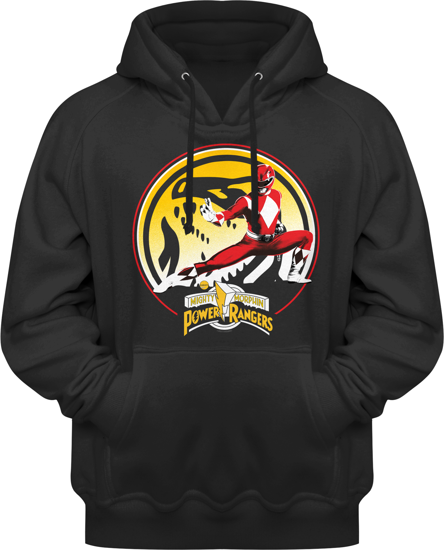 This 80sTees.com exclusive Mighty Morphin Power Rangers hoodie shows the Red Ranger posing in front of his Tyrannosaurus Power Coin.