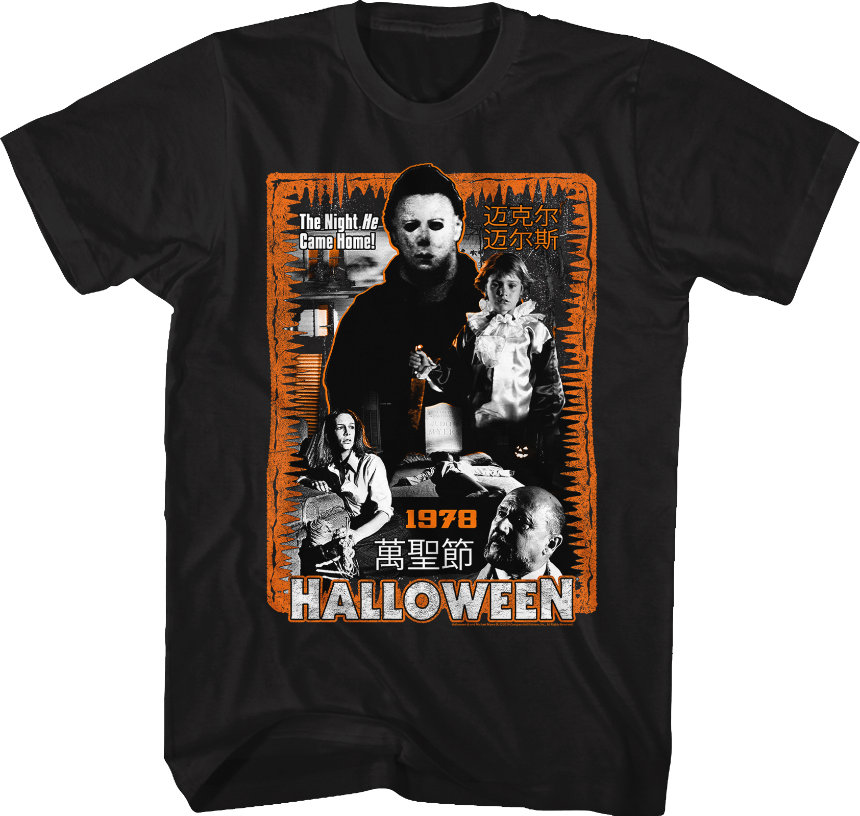 This Halloween t-shirt features a Japanese poster for the terrifying 1978 classic. The poster shows Michael Myers as a child after he murdered his sister; Michael as an adult in his iconic mask; Michael's first victim, Judith Myers laid out in front of her tombstone; Samuel Loomis, the doctor that understood how dangerous Michael was; and Laurie Strode, the teenage babysitter that Michael stalked throughout the movie.