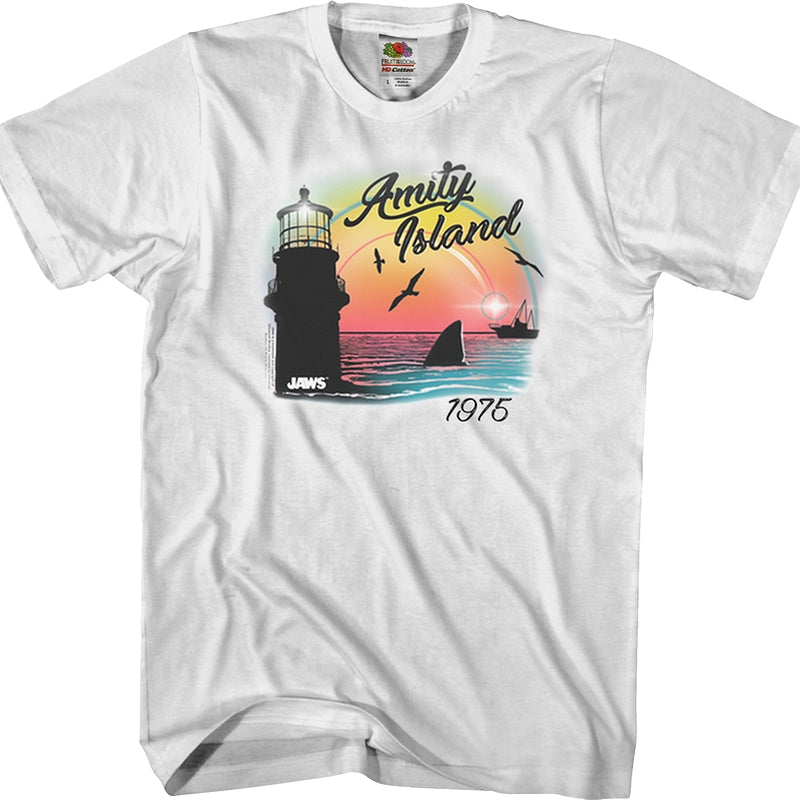 For any fan of the terrifying classic Jaws, this Airbrush Amity Island t-shirt is a must have!