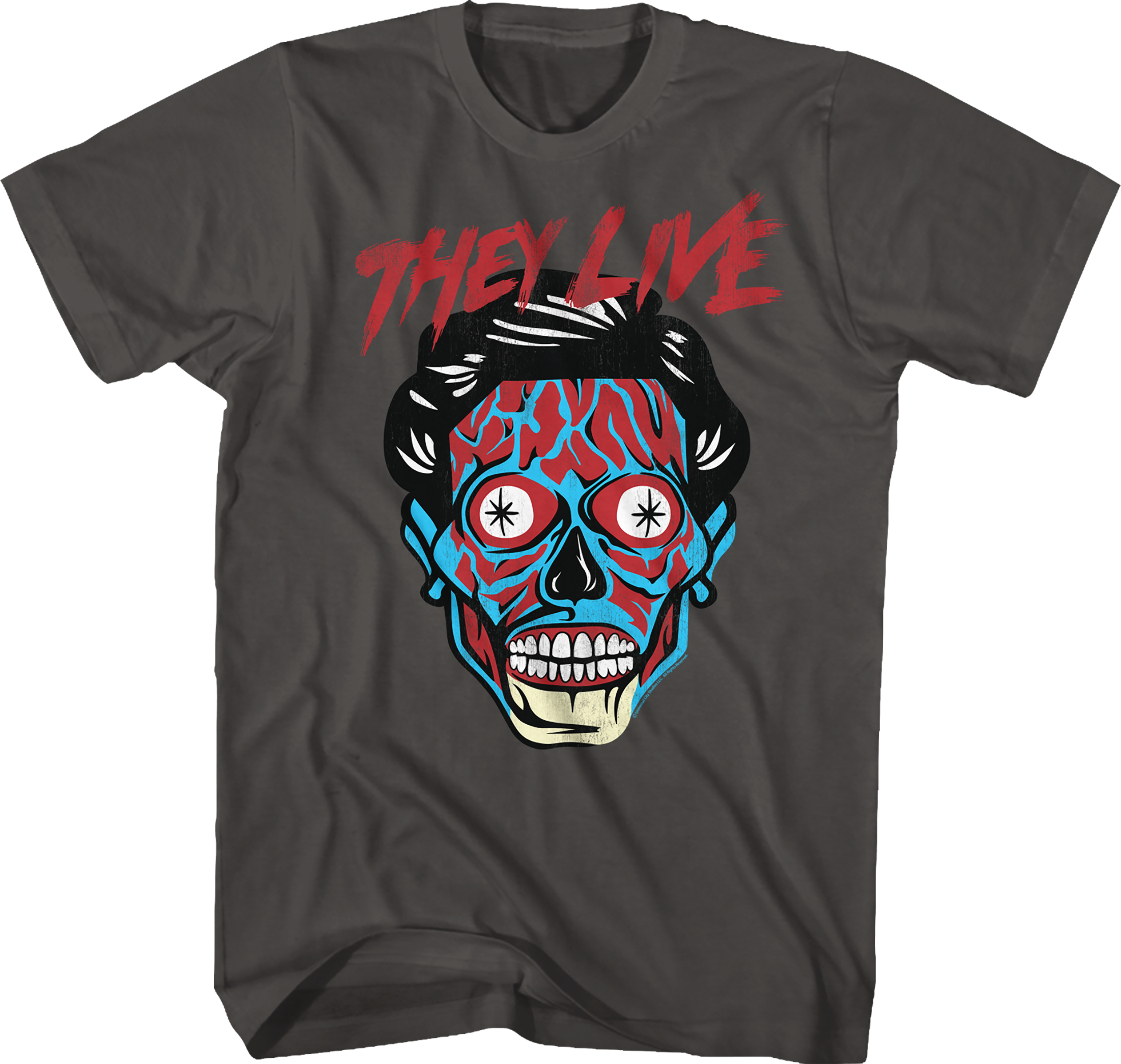 This They Live t-shirt features a close-up image of an alien's face from the 1988 cult classic. This is what John Nada saw when he put on his sunglasses that allowed him to see the difference between humans and disguised aliens.