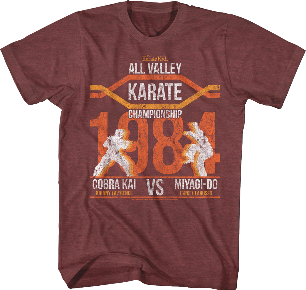This Karate Kid t-shirt shows silhouettes of Johnny Lawrence and Daniel LaRusso ready to face off in the championship round of the 1984 All Valley Karate Tournament.