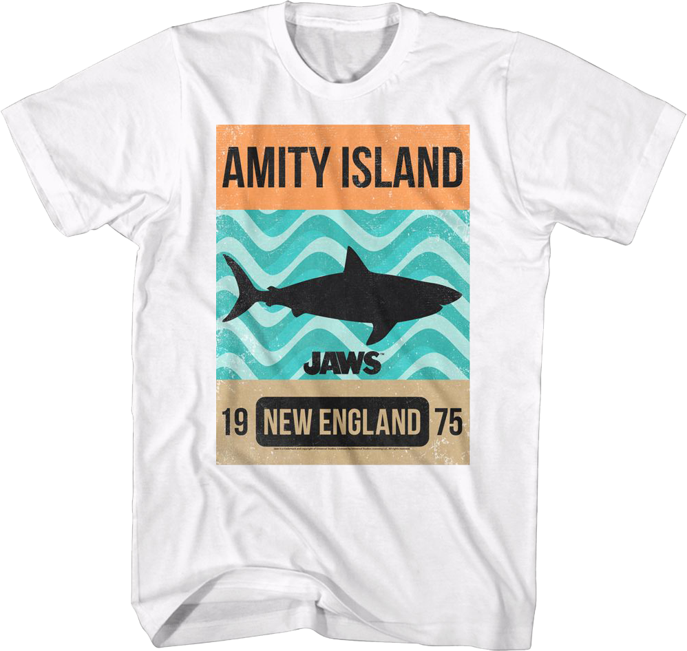 In Jaws, a great white shark terrorized Amity Island until Chief Brody, Matt Hooper and Quint boarded the Orca to catch the shark in one of the most terrifying movies of all time. For any fan of Steven Spielberg's 1975 classic, this Amity Island Shark Waves Jaws T-Shirt is a must have!