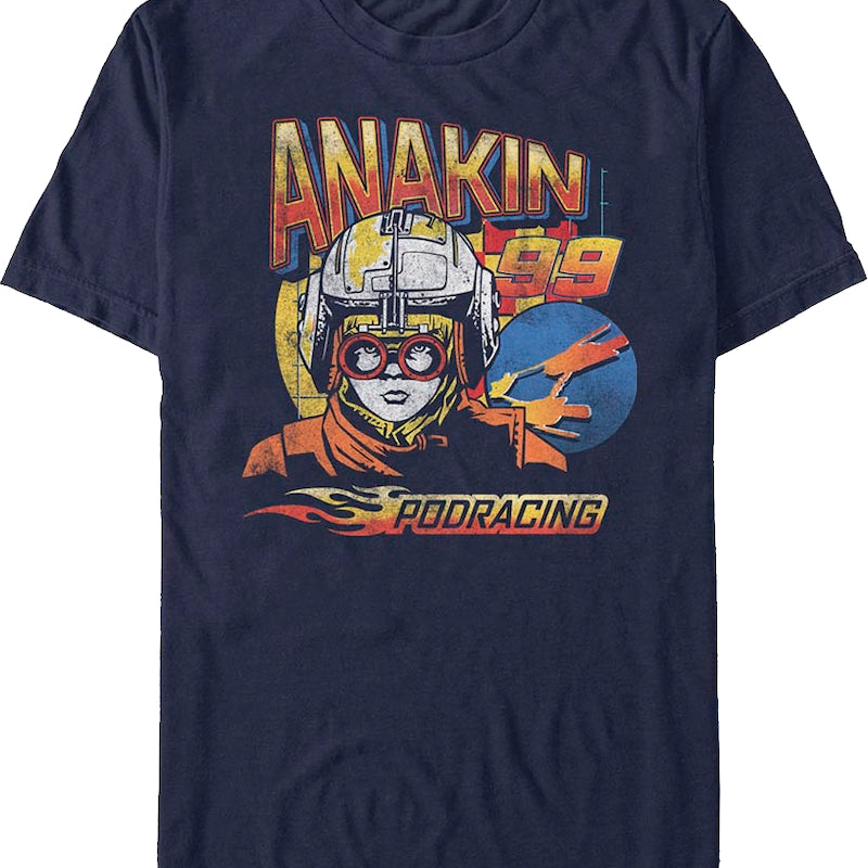 This Star Wars t-shirt shows young Anakin Skywalker ready to enter a podrace with a NASCAR-style checkered flag and racing number 99.