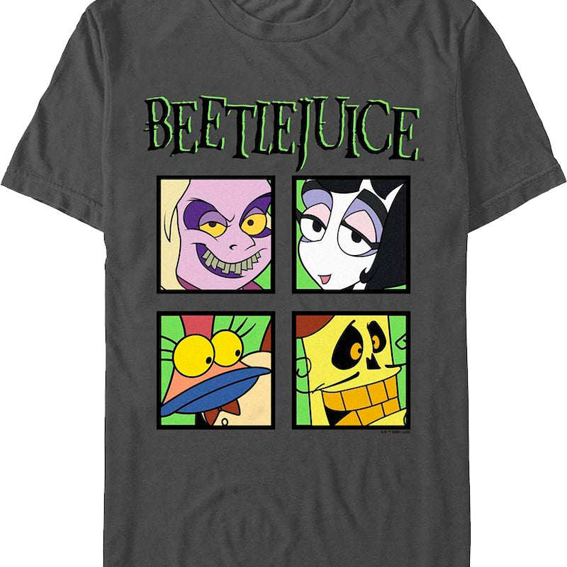 This Beetlejuice t-shirt features images of characters from the popular animated series. The shirt shows Beetlejuice, Lydia Deetz, Ginger, and Jacques LaLean.