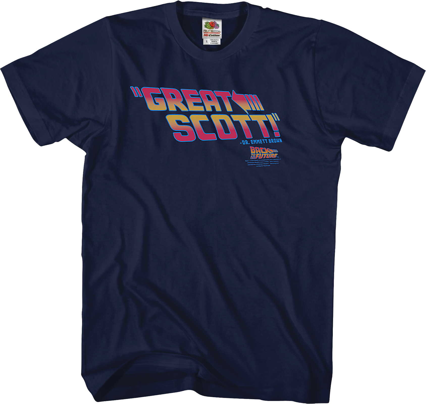 Doc Brown sure was surprised a lot during the Back To The Future trilogy. This Back to the Future shirt features his catchphrase "Great Scott" in a style reminiscent of the movie logo. Bill wears this shirt and gets angry when young whipper snappers don't get what it means.