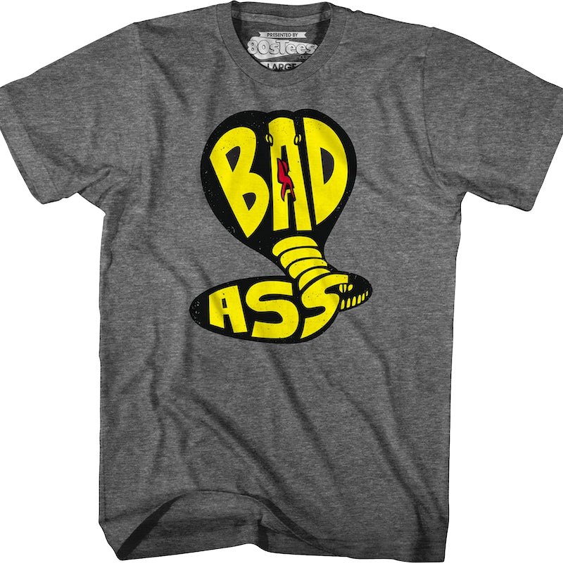 This 80sTees.com exclusive Cobra Kai t-shirt shows the cobra shape of the Cobra Kai dojo's logo, and the logo reads Bad Ass.