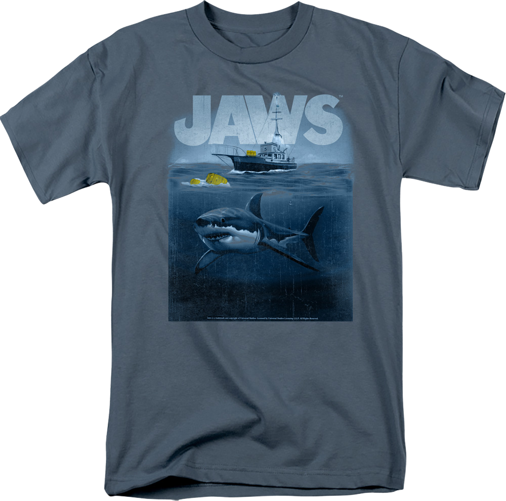 Jaws set box office records and is referred to as the first modern day blockbuster. Let everyone know that you are a fan of Steven Spielberg's 1975 classic with this Barrels Jaws T-Shirt!