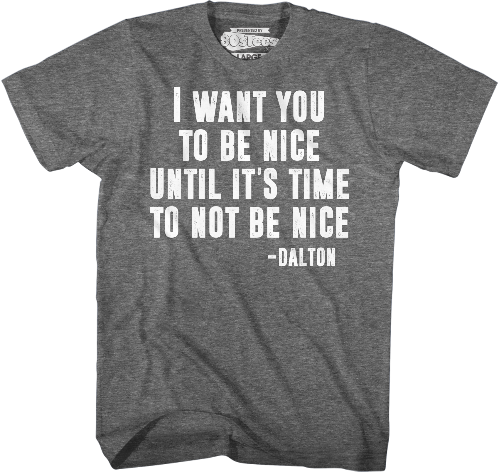 This Road House t-shirt features the quote I Want You To Be Nice Until It's Time To Not Be Nice, which was delivered by professional bouncer James Dalton in the 1989 movie.