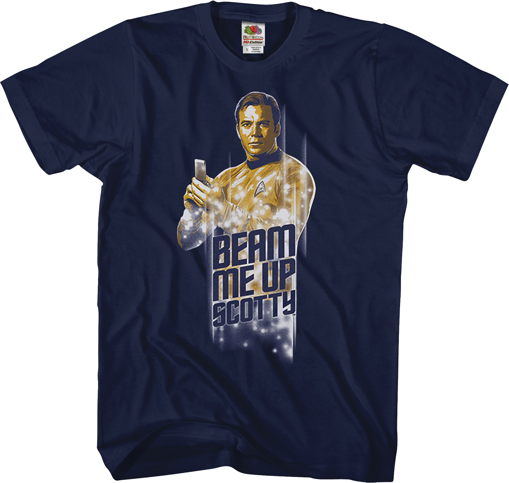 This Star Trek t-shirt features an image of Captain James T. Kirk. The shirt reads Beam Me Up Scotty.