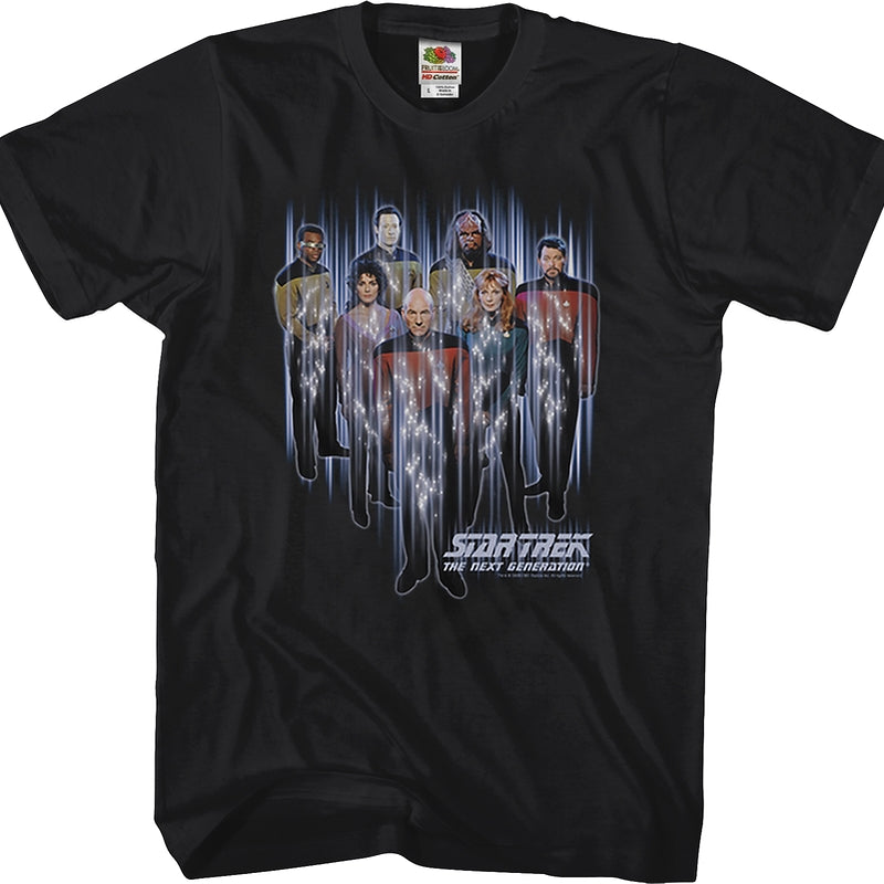 This Beaming Up Star Trek The Next Generation T-Shirt features the cast of the hit series that was set 70 years after the final mission of the original crew of the USS Enterprise. The shirt shows Geordi La Forge, Data, Deanna Troi, Jean-Luc Picard, Worf, Beverly Crusher, and William Riker being beamed up. The cast is pictured above the Enterprise and the Star Trek The Next Generation logo.