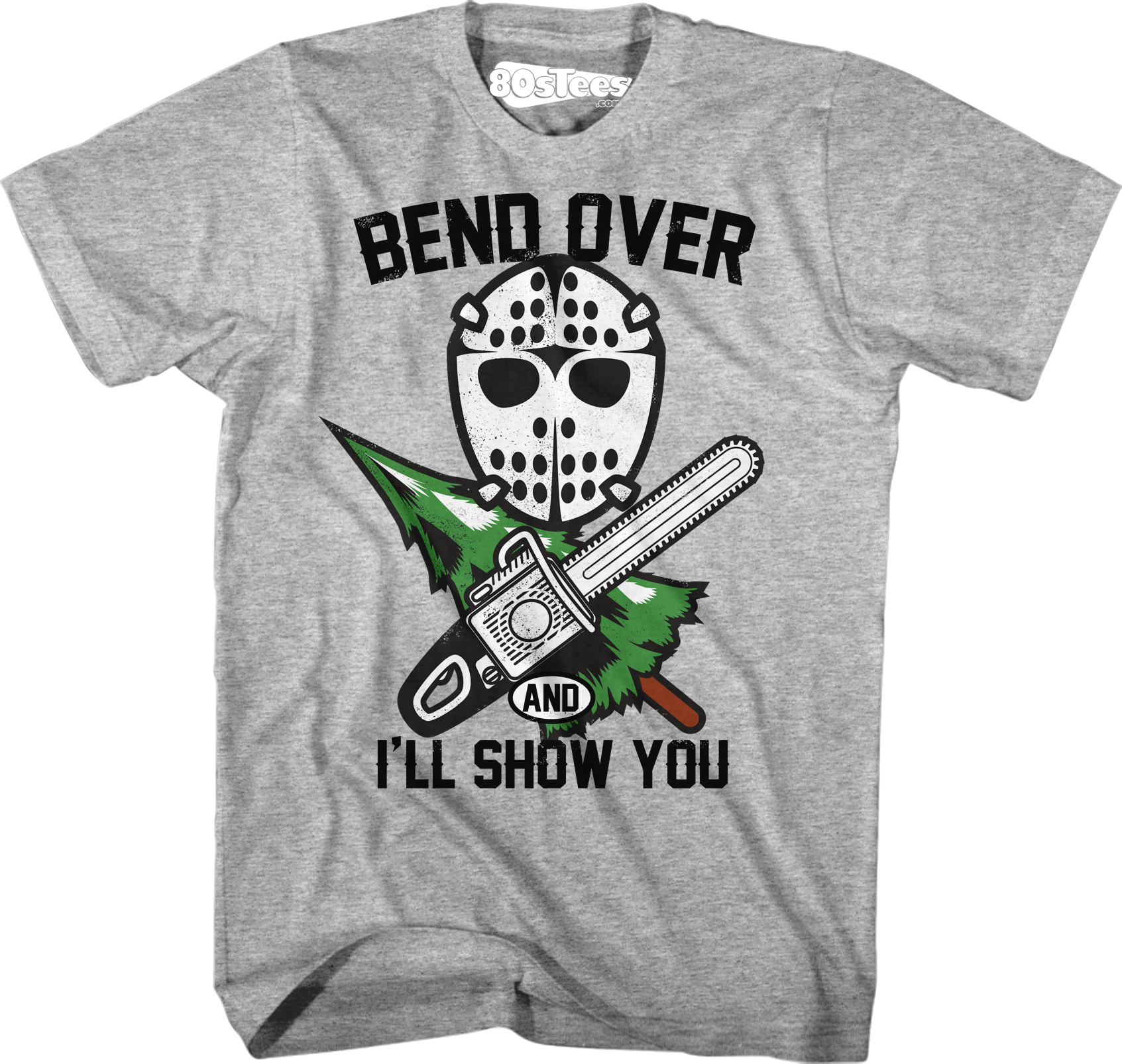 This 80sTees.com exclusive National Lampoon's Christmas Vacation t-shirt shows a hockey mask above a chainsaw crossed with a tree. The shirt reads Bend Over And I'll Show You.