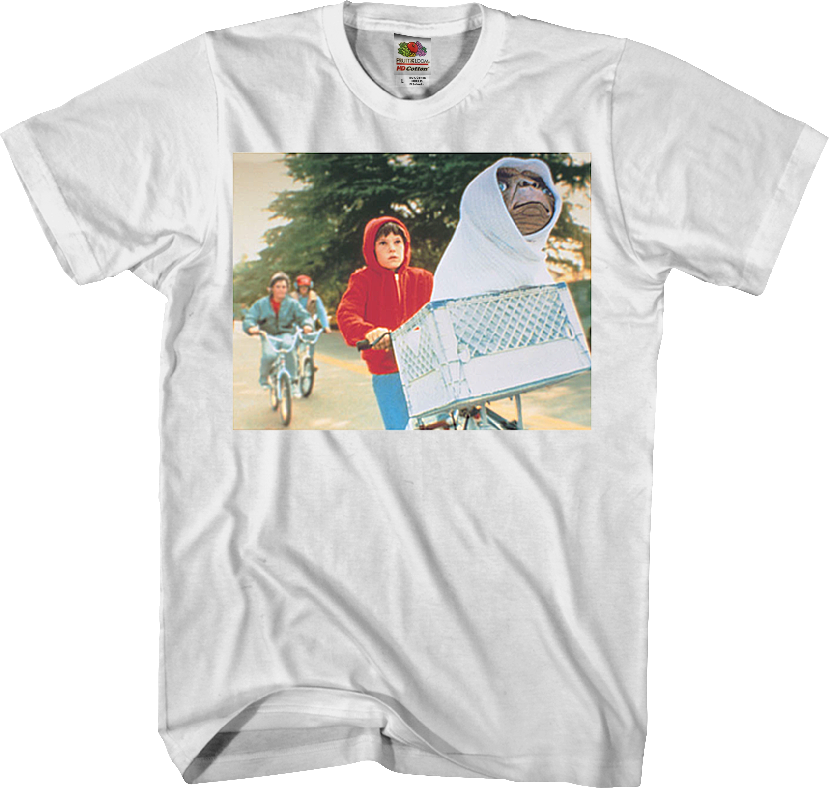 This ET shirt shows Elliot riding his bicycle with ET wrapped in a blanket in the bike's front basket.