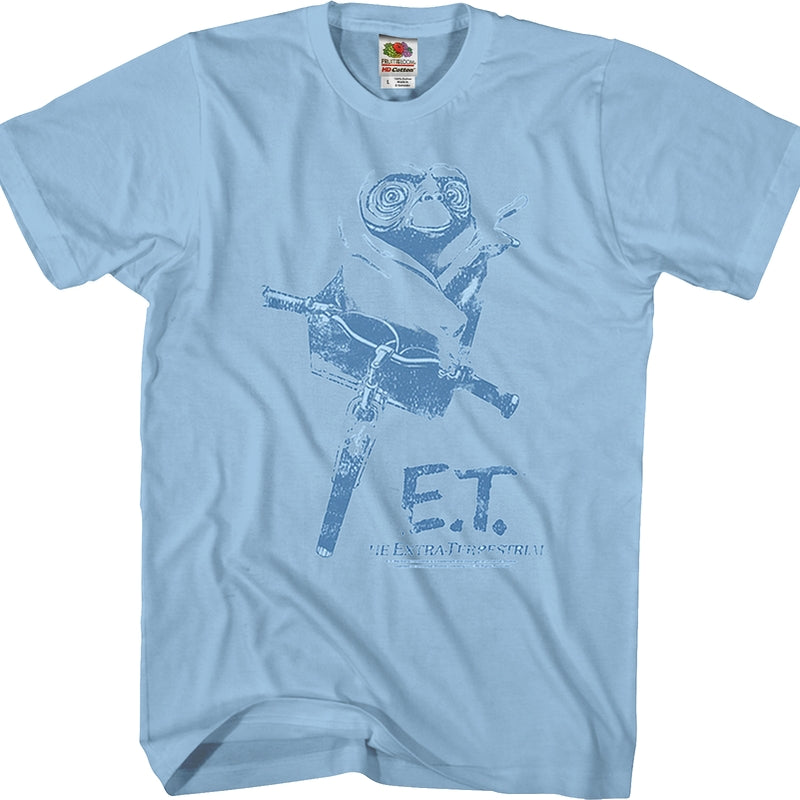 This ET shirt shows ET bundled up in a blanket in Elliot's bicycle basket, ready for his magical bike ride through the sky.
