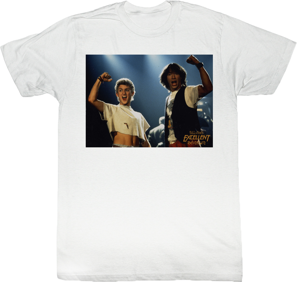 This Bill and Ted shirt features the time traveling founders of the rock group Wyld Stallyns.