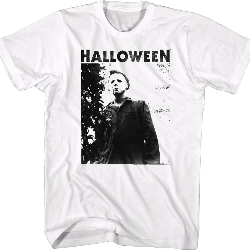 This Halloween t-shirt features a black and white photograph of Michael Myers, the maniac who brought true terror to Haddonfield in October of 1978.