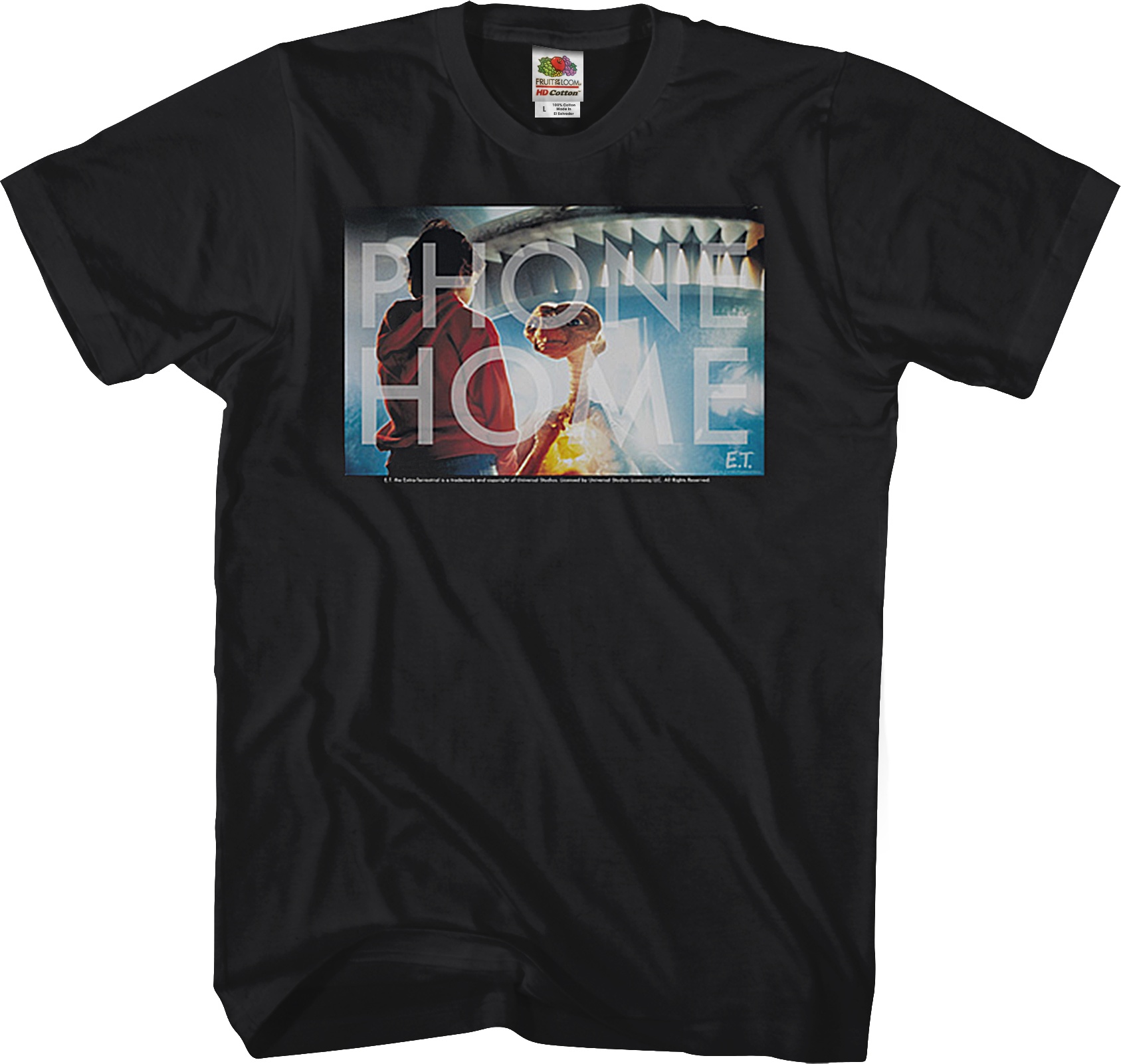 This ET shirt shows ET ready to get on a spaceship to go home. The shirt includes one of the most famous quotes from the movie, "Phone Home".