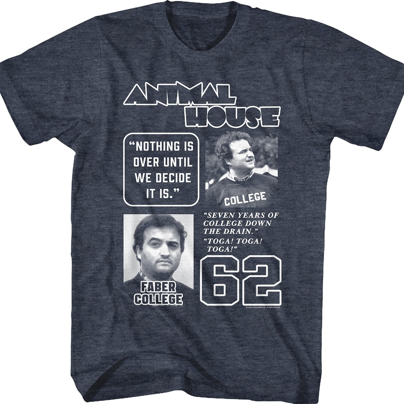 Who would have guessed that a pre med student with a 0.0 grade average would become one of the greatest characters in cinematic history? John "Bluto" Blutarsky was a fat, drunk, and stupid student at Faber College, and his hilarious quotes helped to make Animal House an instant comedy classic. This Animal House t-shirt features images of of Bluto and his quotes "Nothing is over until we decide it is", "Seven years of college down the drain", and "Toga! Toga! Toga!"