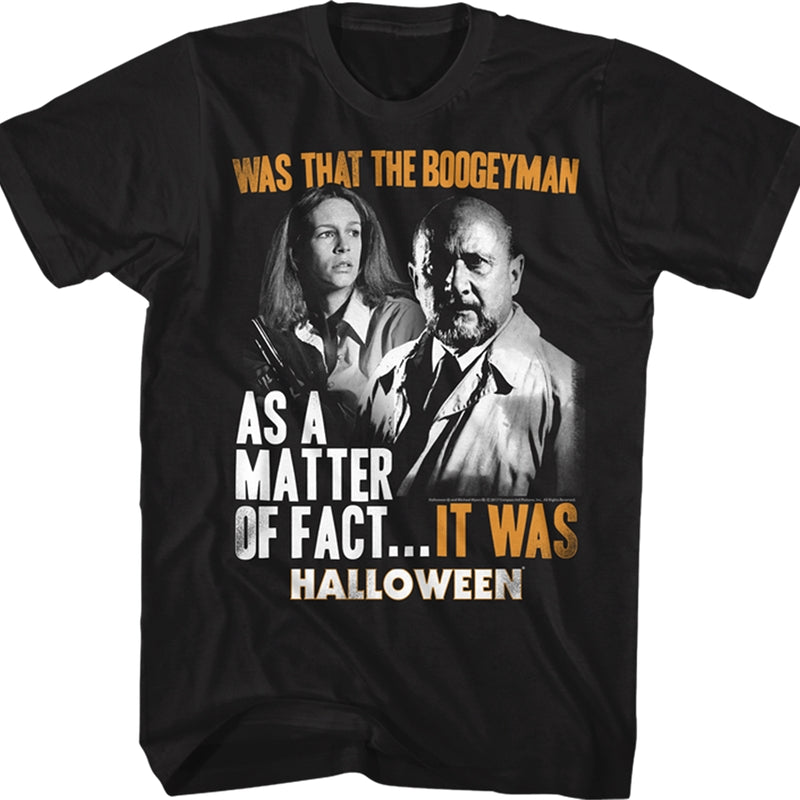 This Halloween t-shirt features an image of Dr. Samuel Loomis and Laurie Strode. The top of the shirt reads Was That The Boogeyman. The bottom of the shirt reads As A Matter Of Fact...It Was.