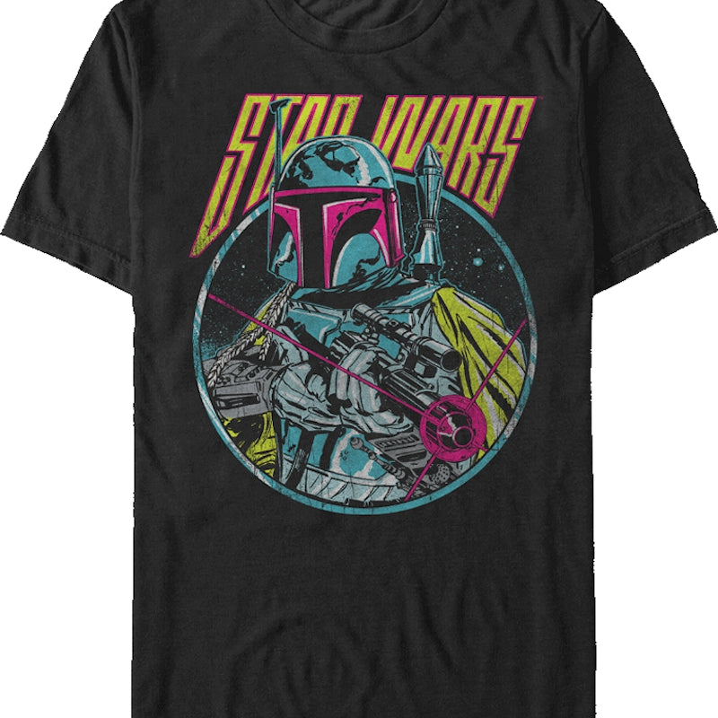 This Star Wars t-shirt features a retro-look image of the bounty hunter Boba Fett, in bright hues of fuchsia, yellow, and turquoise. Boba Fett is ready to blast whoever or whatever gets in his way!