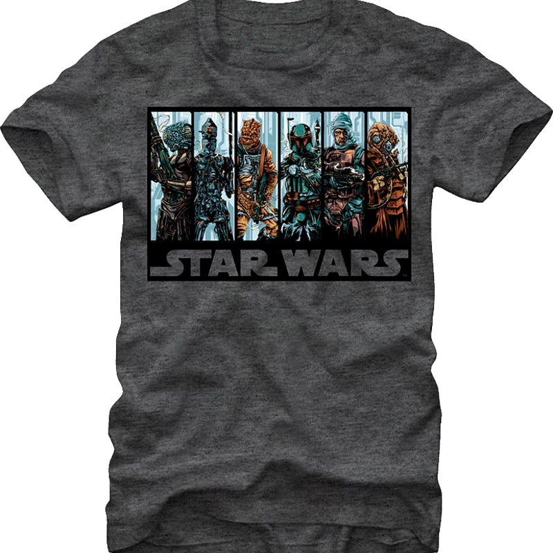This Bounty Hunters Star Wars T-Shirt shows colorful images of six of the most talented hunters for hire in the universe. 4-LOM, IG-88, Bossk, Boba Fett, Dengar, and Zuckuss are all shown here ready to take down their next target. These bad guys were hired by both Darth Vader and Jabba the Hutt to deliver Han Solo and the Millennium Falcon.