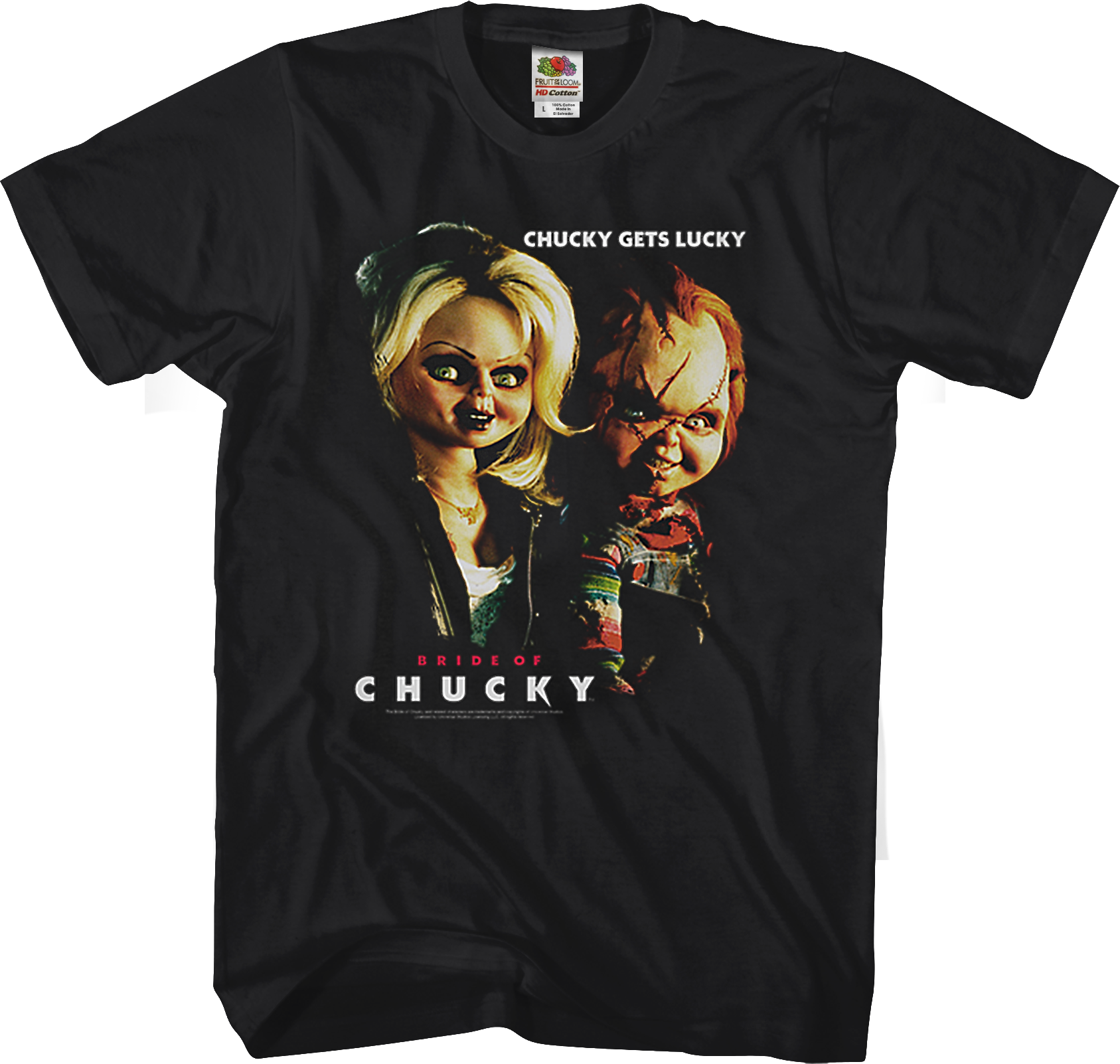 This Bride of Chucky t-shirt features an image of Tiffany and Chucky. The shirt reads Chucky Gets Lucky.
