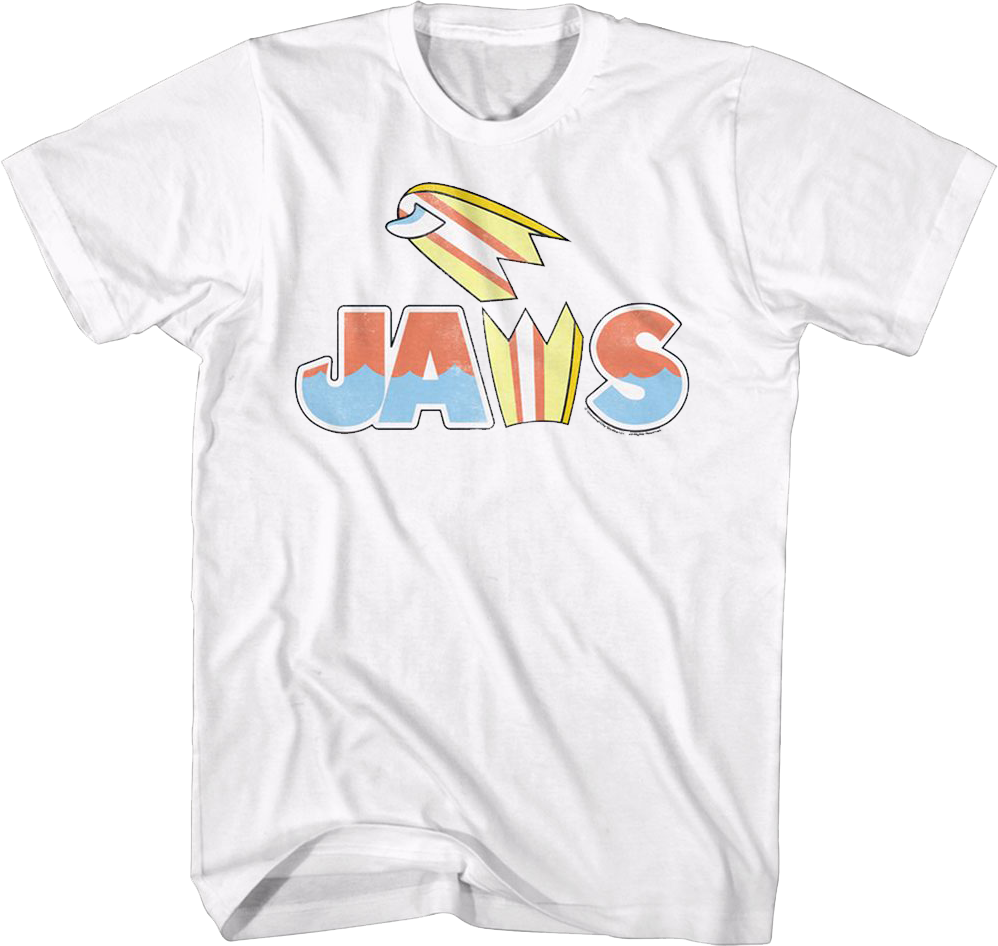 This Jaws t-shirt shows the movie's title, with the "W" being a surfboard that has been bitten in half by a great white shark.