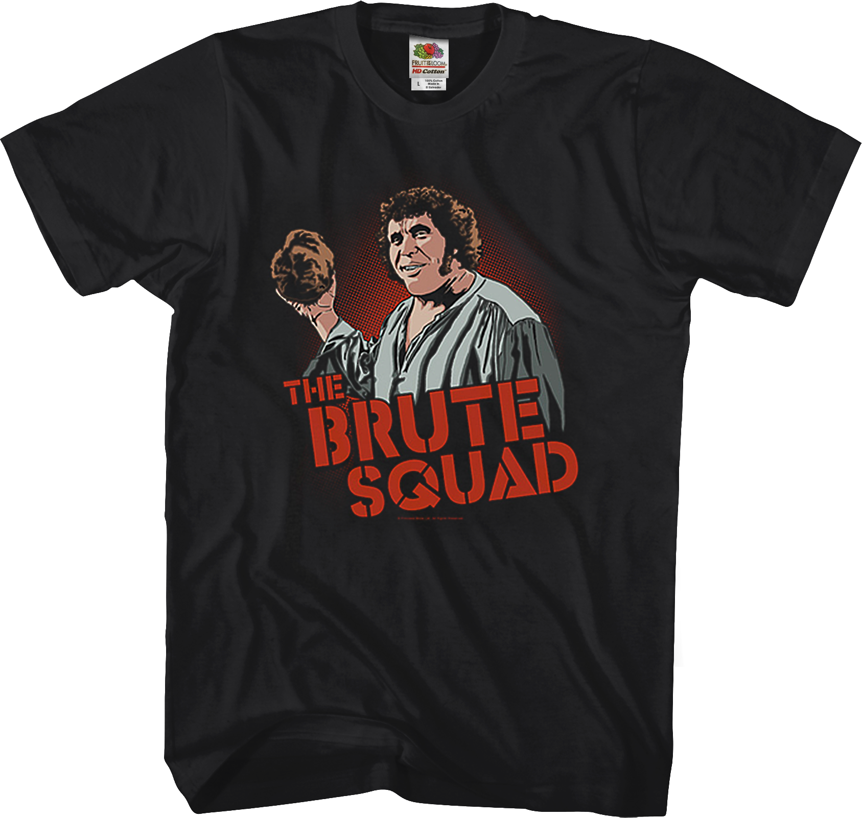 This Princess Bride t-shirt shows an image of Fezzik, a giant who doesn't even excercise but is still strong enough to be a one-man Brute Squad. In this picture, Fezzik is preparing to put down his rock so that he can kill the Man in Black like a civilized person.