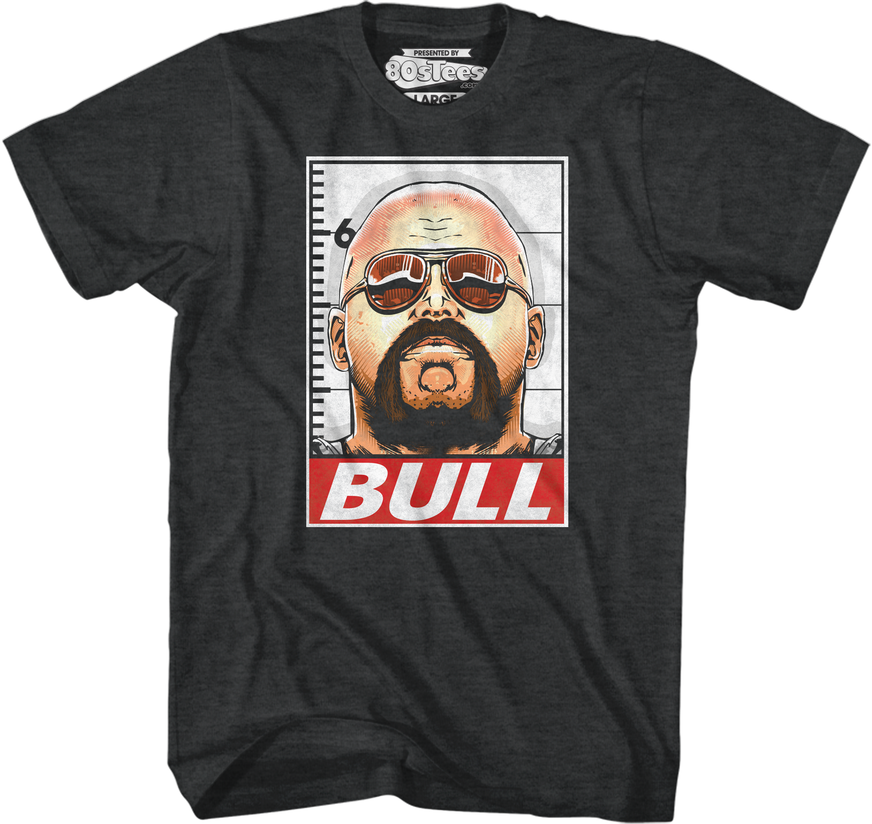This Over The Top t-shirt features an image of arm wrestler Bull Hurley standing at a police line up measurement wall.