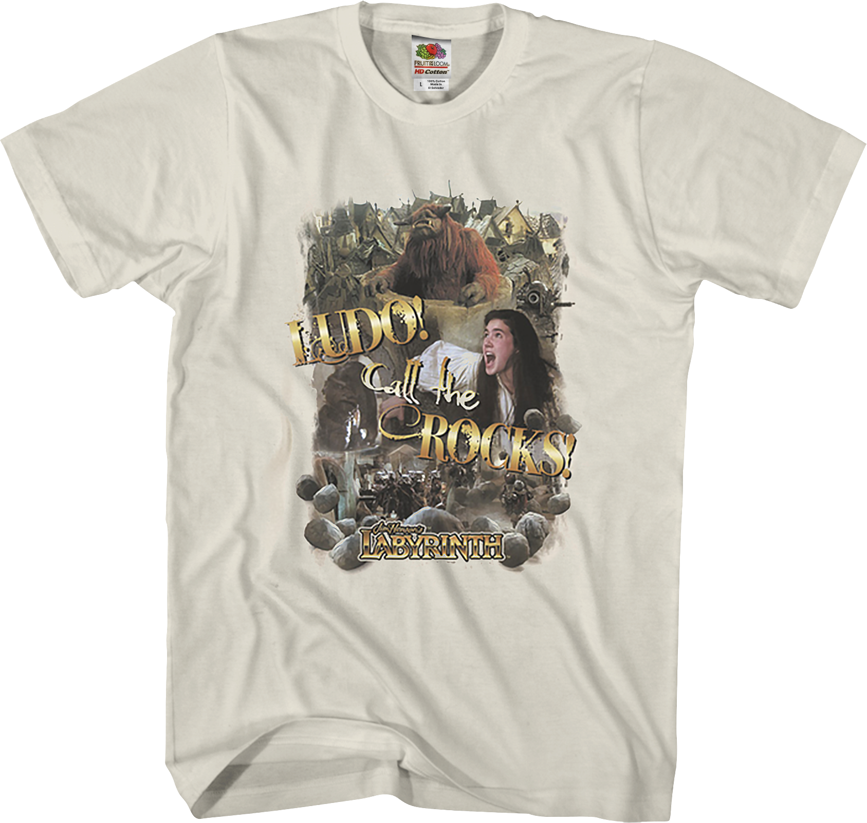 This Labyrinth t-shirt shows Sarah dangling from a bridge after it had collapsed. Sarah is yelling to Ludo and the shirt reads Ludo! Call the Rocks!