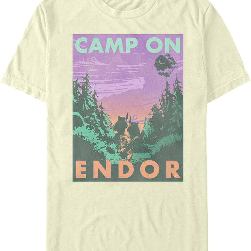 This Star Wars t-shirt shows a colorful travel poster that features Ewoks on the forest moon of Endor. The shirt reads Camp On Endor.