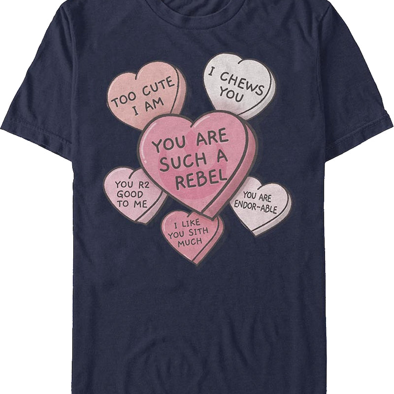 The Valentine's Day candy hearts on this shirt are made for Yoda, Chewbacca, Han Solo, R2-D2, Darth Vader and the Ewoks. The hearts read Too Cute I Am, I Chews You, You Are Such A Rebel, You R2 Good To Me, I Like You Sith Much, and You Are Endor-Able.