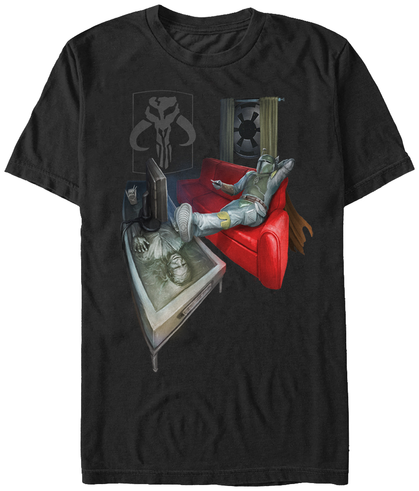 This Star Wars Shirt shows Boba Fett after he took possession of Han Solo but before he delivered him to Jabba the Hut. The bounty hunter is lounging on his couch with his feet propped up on Han Solo's frozen body.