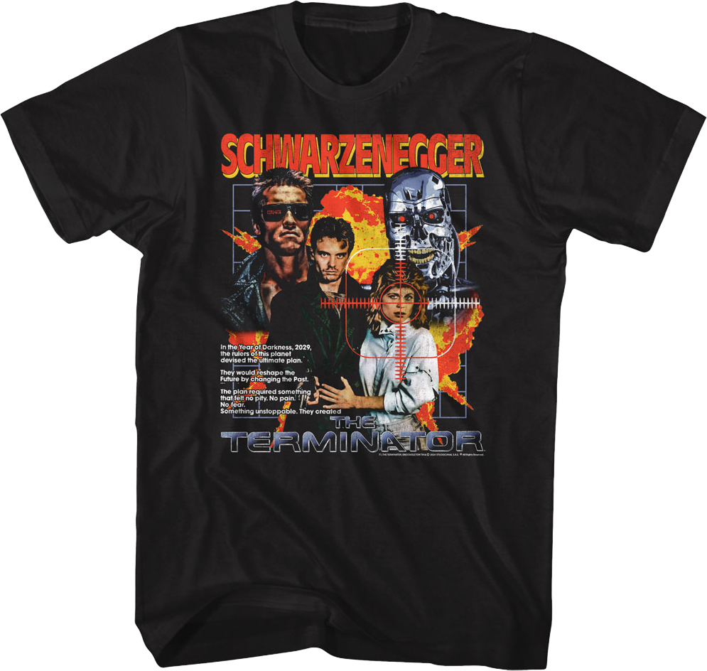 This Terminator t-shirt shows Arnold Schwarzenegger, Michael Biehn, and Linda Hamilton on a poster for the 1984 classic. The shirt includes the tagline "In the Year of Darkness, 2029, the rulers of this planet devised the ultimate plan. They would reshape the Future by changing the Past. The plan required something that felt no pity. No pain. No fear. Something unstoppable. They created The Terminator."