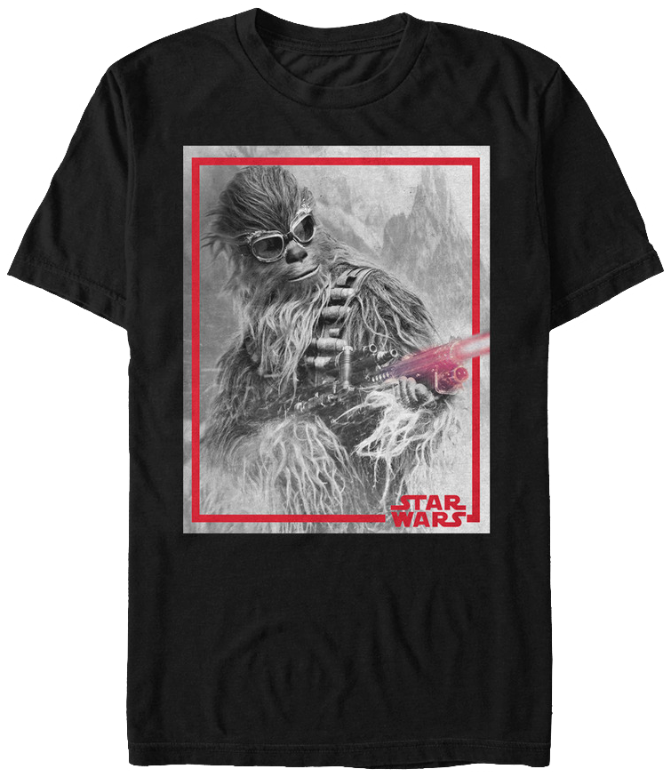This Star Wars t-shirt shows Chewbacca wearing goggles and firing a gun during a train heist on the plant Vandor in the movie Solo: A Star Wars Story.