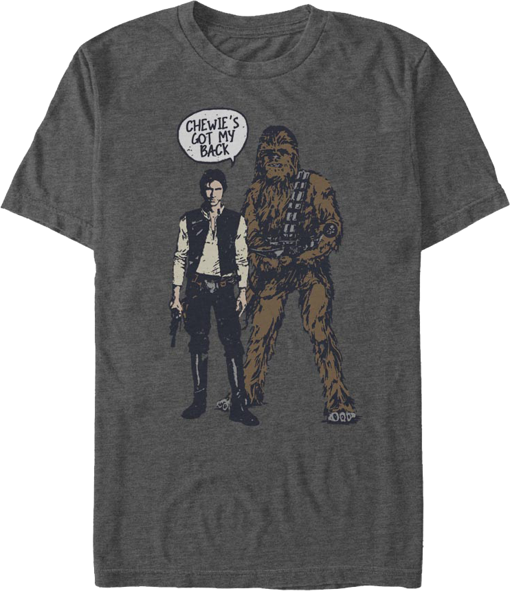 This Star Wars t-shirt shows Han Solo posing with his Millennium Falcon co-pilot Chewbacca. Han is saying, "Chewie's Got My Back".