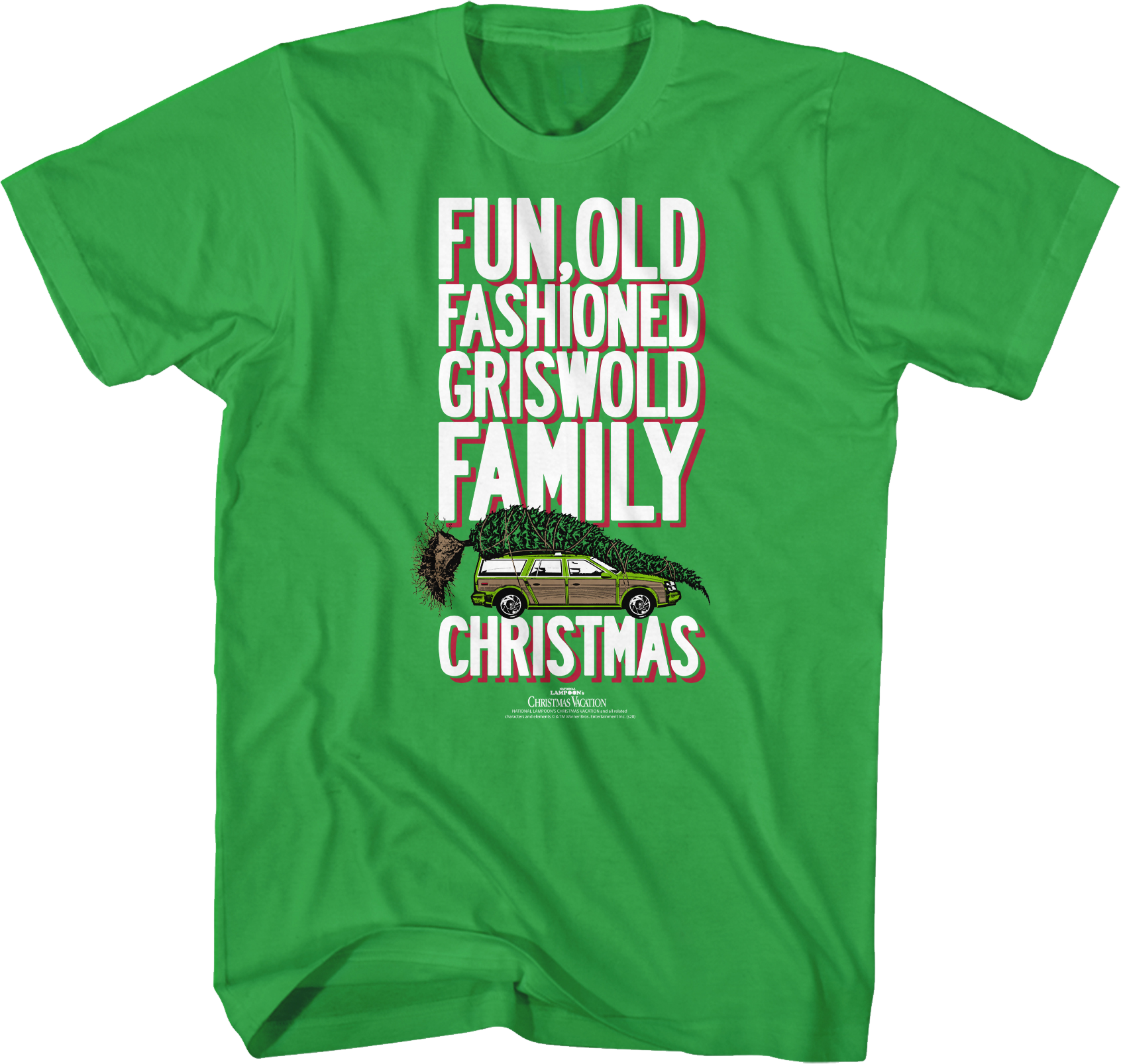 This National Lampoon's Christmas Vacation shirt features the Griswold's truckster station wagon with the enormous Christmas Tree tied to the roof. As you will remember, Clark and family hiked through miles of snow but did not bring a saw. That is why you see the root ball on the tree.