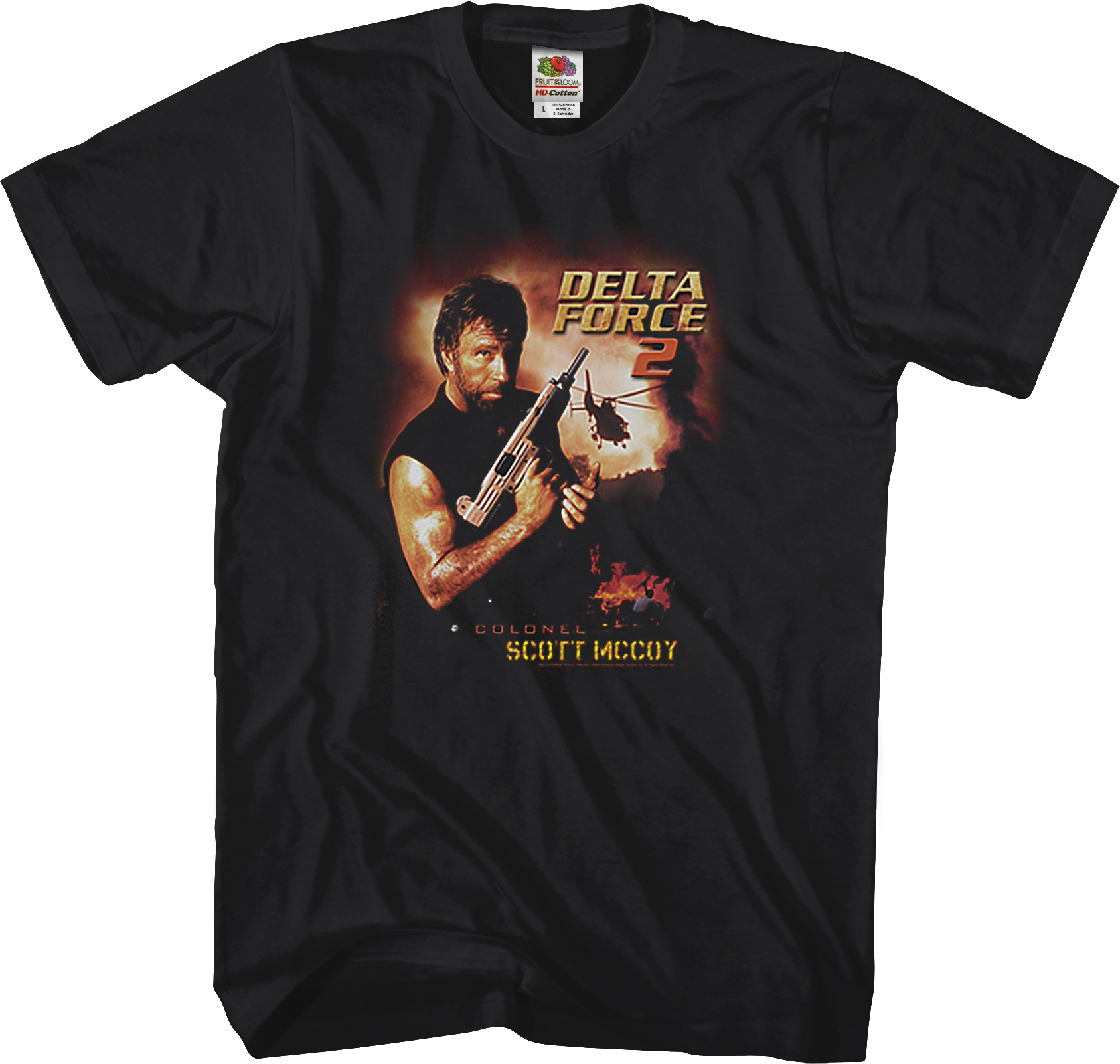 This t-shirt features the poster artwork for Delta Force 2. The artwork shows Chuck Norris as Col. Scott McCoy ready to take action and rescue hostages.