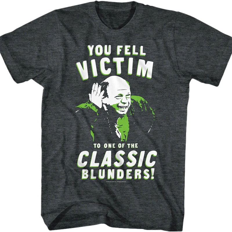 This Princess Bride t-shirt features an image of Vizzini. The shirt reads You Fell Victim To One Of The Classic Blunders!