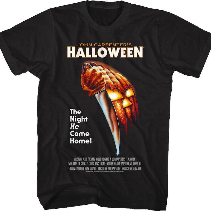 This Halloween t-shirt features the iconic poster for John Carpenter's terrifying 1978 classic. The poster shows the knife-wielding hand of Michael Myers in front a Jack-o-Lantern. The shirt includes the movie's tagline, "The Night He Came Home!"