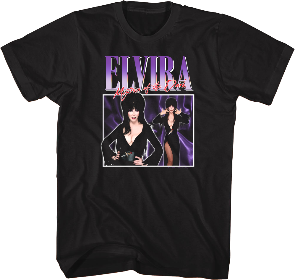 Elvira was the host of the TV series Elvira's Movie Macabre, where she was known for her gothic, scantily clad wardrobe along with a dark sense of humor. Elvira became became so famous that she became a pop culture icon and the star of her own movie, Elvira: Mistress of the Dark. Let everyone know you are a fan of the unforgettable character portrayed by Cassandra Peterson when you wear this Collage Poses Elvira T-Shirt!