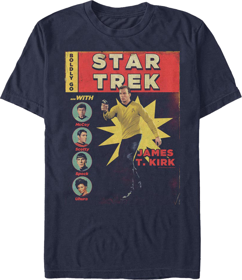 In the original Star Trek series, the crew of the Enterprise explored strange new worlds, sought out new life and new civilizations, and boldly went where no man had gone before. Everyone will immediately know that you are a true Trekkie when you wear this Comic Book Cover Star Trek T-Shirt!
