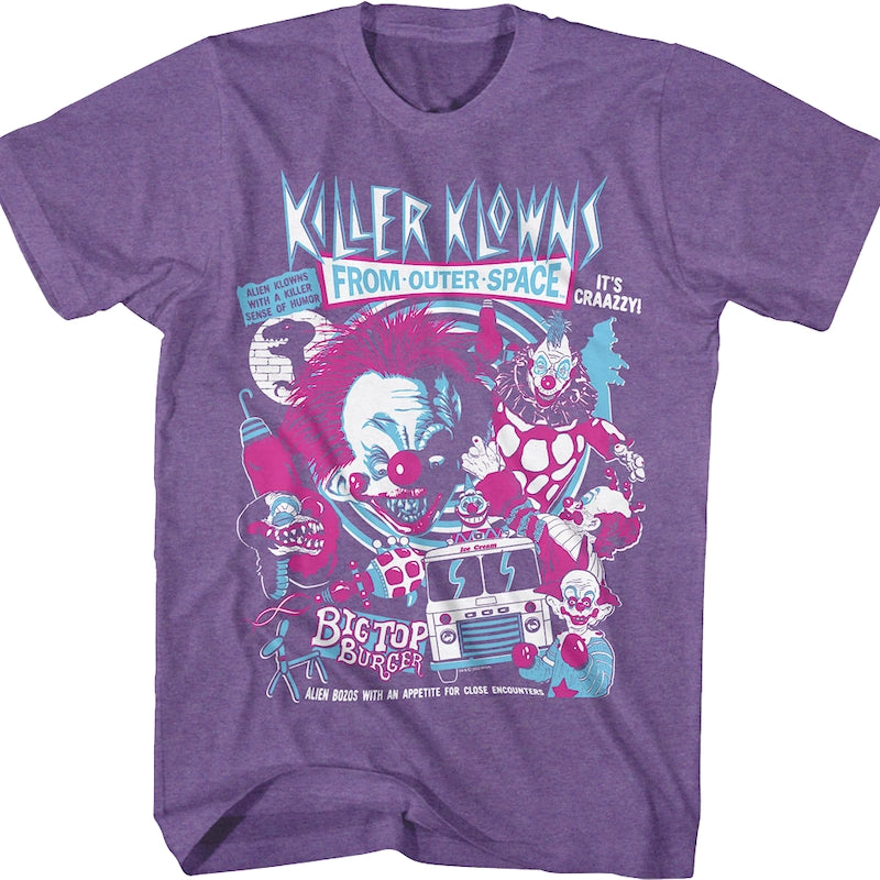 In Killer Klowns From Outer Space, evil aliens disguised as circus clowns arrive on Earth and invade a small town in order to capture, kill, and harvest the human inhabitants to use as sustenance. With a combination of gore and laughs, Killer Klowns From Outer Space is one of the most fun horror/comedy movies of all time. Everyone will instantly know you are a fan of the 1988 cult classic when you wear this Crazy Collage Killer Klowns From Outer Space T-Shirt!