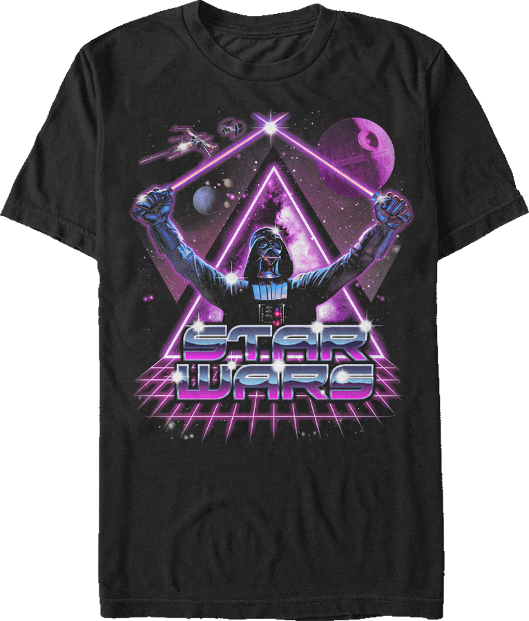 This Star Wars t-shirt features Darth Vader in front of a space scene including an X-Wing and the Death Star. The aesthetic of the design is a retro purplish 80s look.