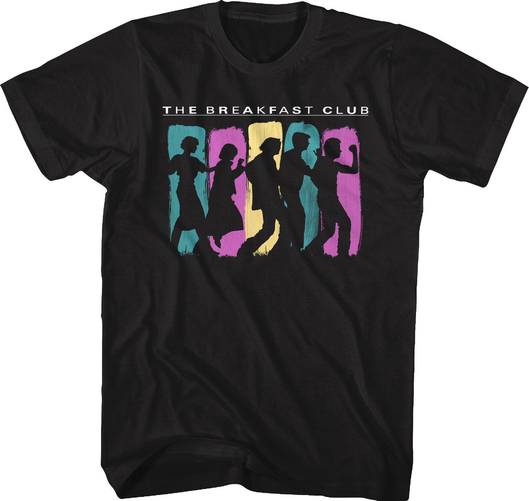 This Dancing Silhouettes Breakfast Club T-Shirt shows outlines of the characters dancing in a line with colorful brushstrokes in the background. Allison, Claire, John, Brian, and Andrew learned more than expected when they found themselves together in Saturday detention. They shared secrets, laughs, tears, and angst in the timeless coming of age story. Each of them showed off their '80s dance moves while they made the most of their time in the school library.