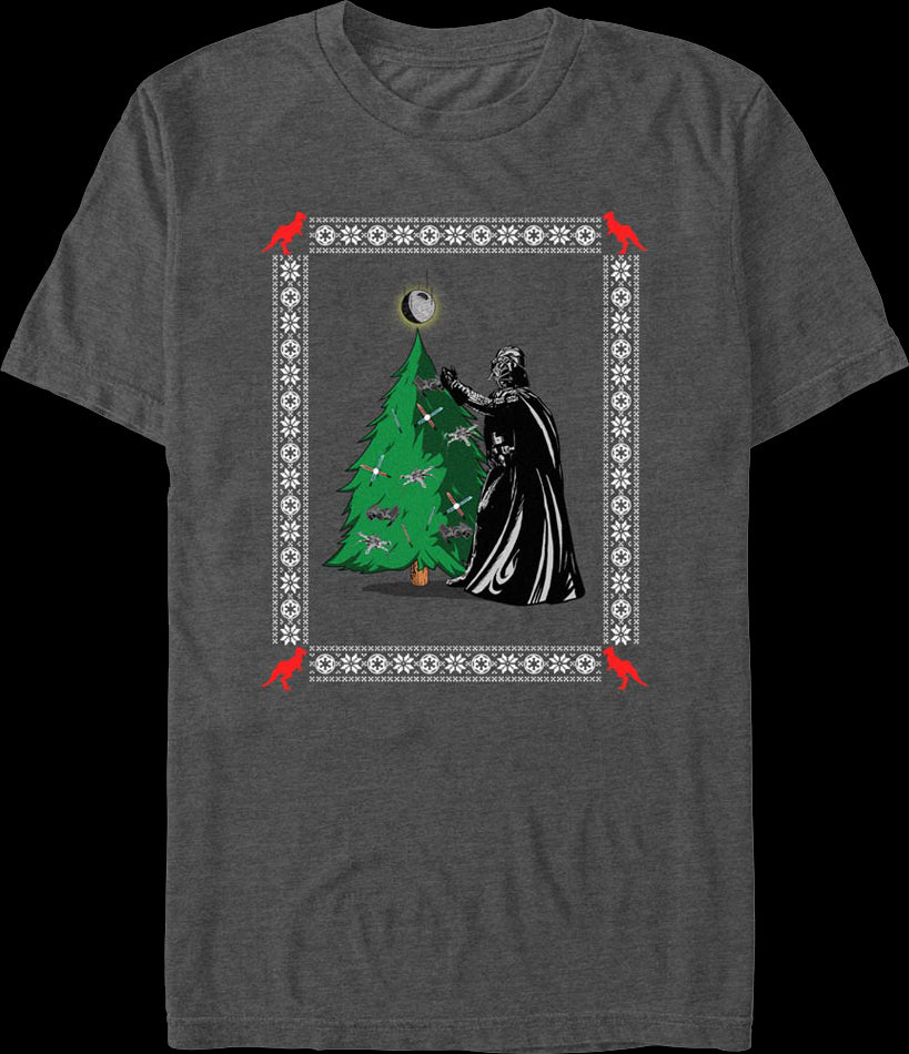 This Star Wars t-shirt shows Darth Vader decorating his Christmas tree. His ornaments include TIE fighters, X-Wing fighters, lightsabers, and the Death Star on top of the tree. This image is in a frame that includes snowflakes, the Galactic Empire logo, and Tauntauns.
