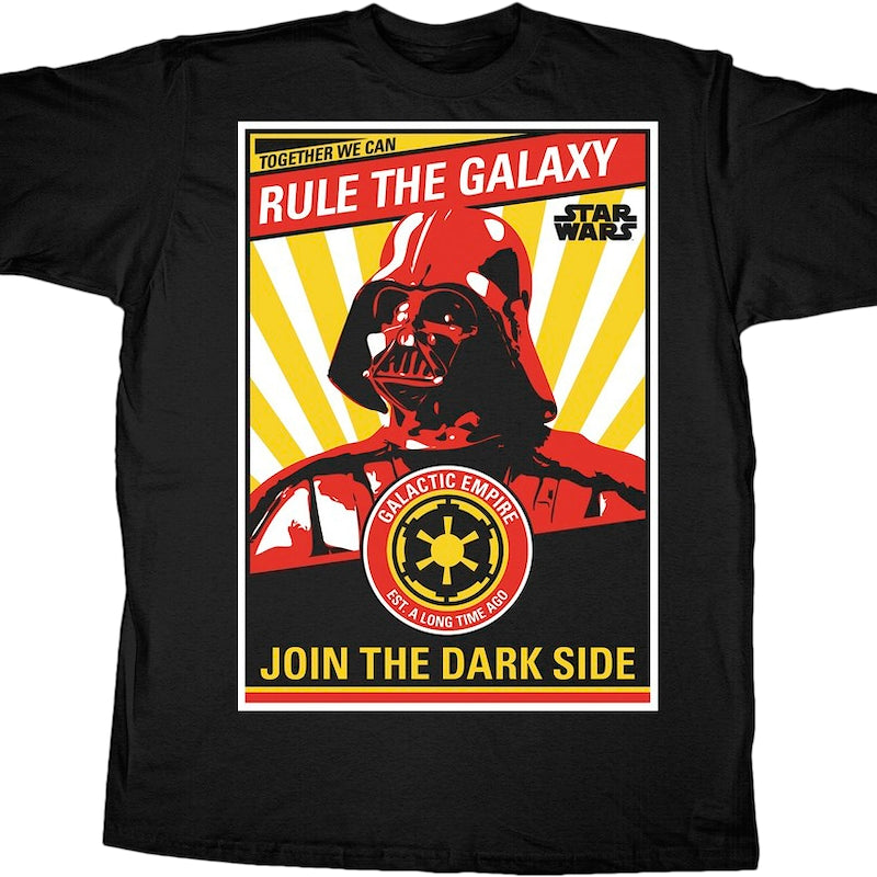Darth Vader is a powerful Sith lord, a leading force in the Galactic Empire, and one of the most popular villains in cinematic history! Vader appears on this t-shirt, which is designed to look like a propaganda poster for the Galactic Empire, which was established a long time ago in galaxy far, far away.
