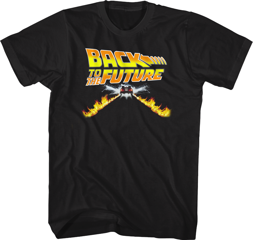 This Back To The Future shirt features the Delorean just after reaching 88 mph, which causes it to leave tracks of fire.