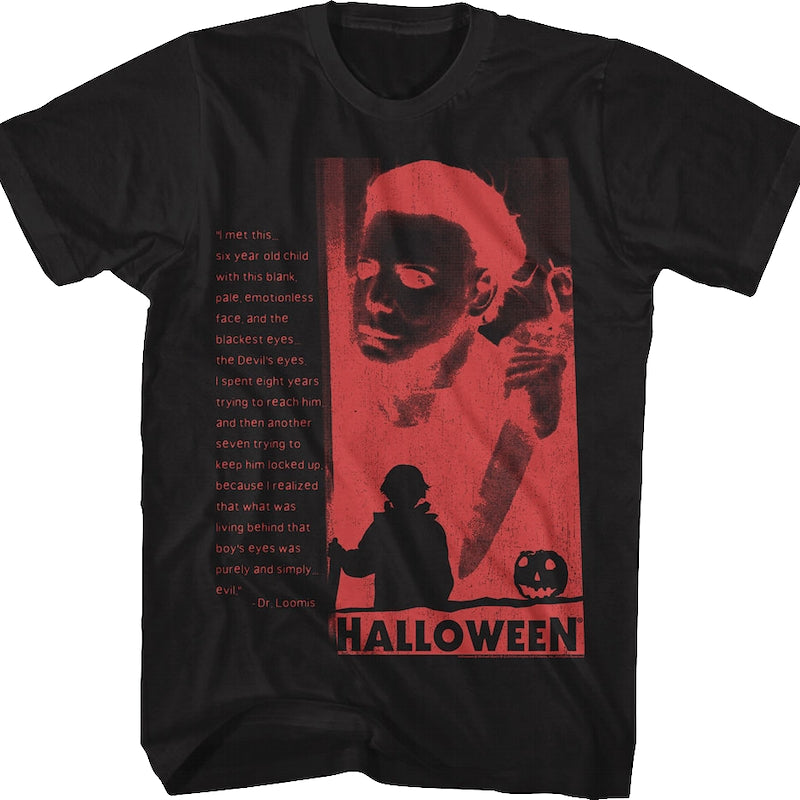 This Halloween t-shirt features a red photo negative of Michael Myers posing with his knife. The shirt also shows a silhouette of young Michael Myers with a knife and a silhouette of a Jack-o'-Lantern. The shirt includes an iconic quote from Dr. Loomis.